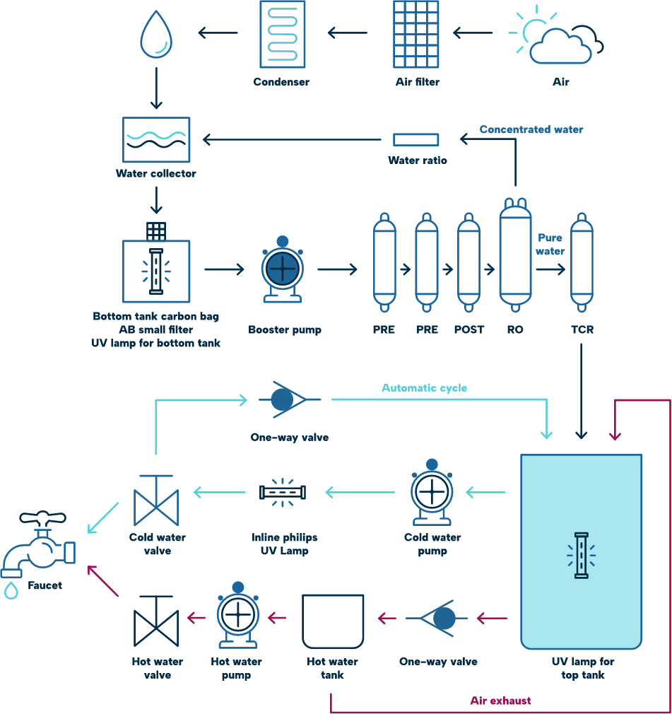 Das gewonnene Wasser durchläuft einen Karbonfilter und wird dann mit UV-Licht desinfiziert, um Bakterien und Viren zu eliminieren.